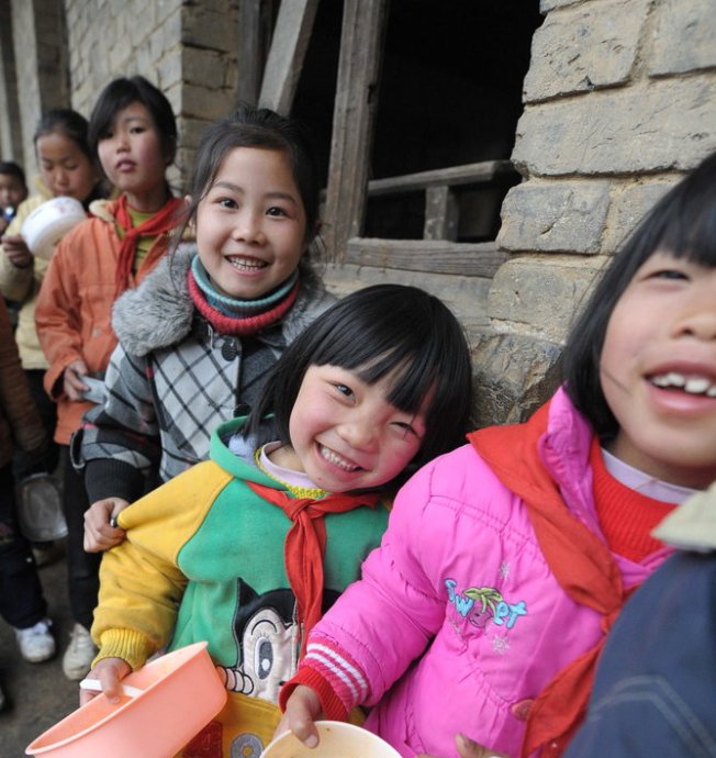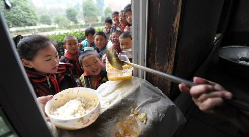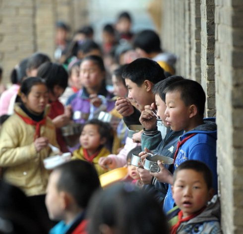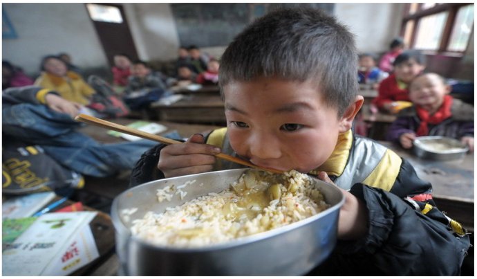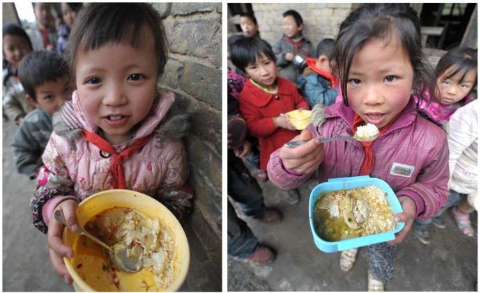 貴州省務川自治縣新場小學有200多個學生,大約有1/3以上有3公里遠的距離。不少孩子中午無法趕回家吃飯。2005年前的新場小學學生,上學只好捎點飯菜,中午冷著吃充饑,更多的時候什么也沒帶,餓著肚子上一天的課。